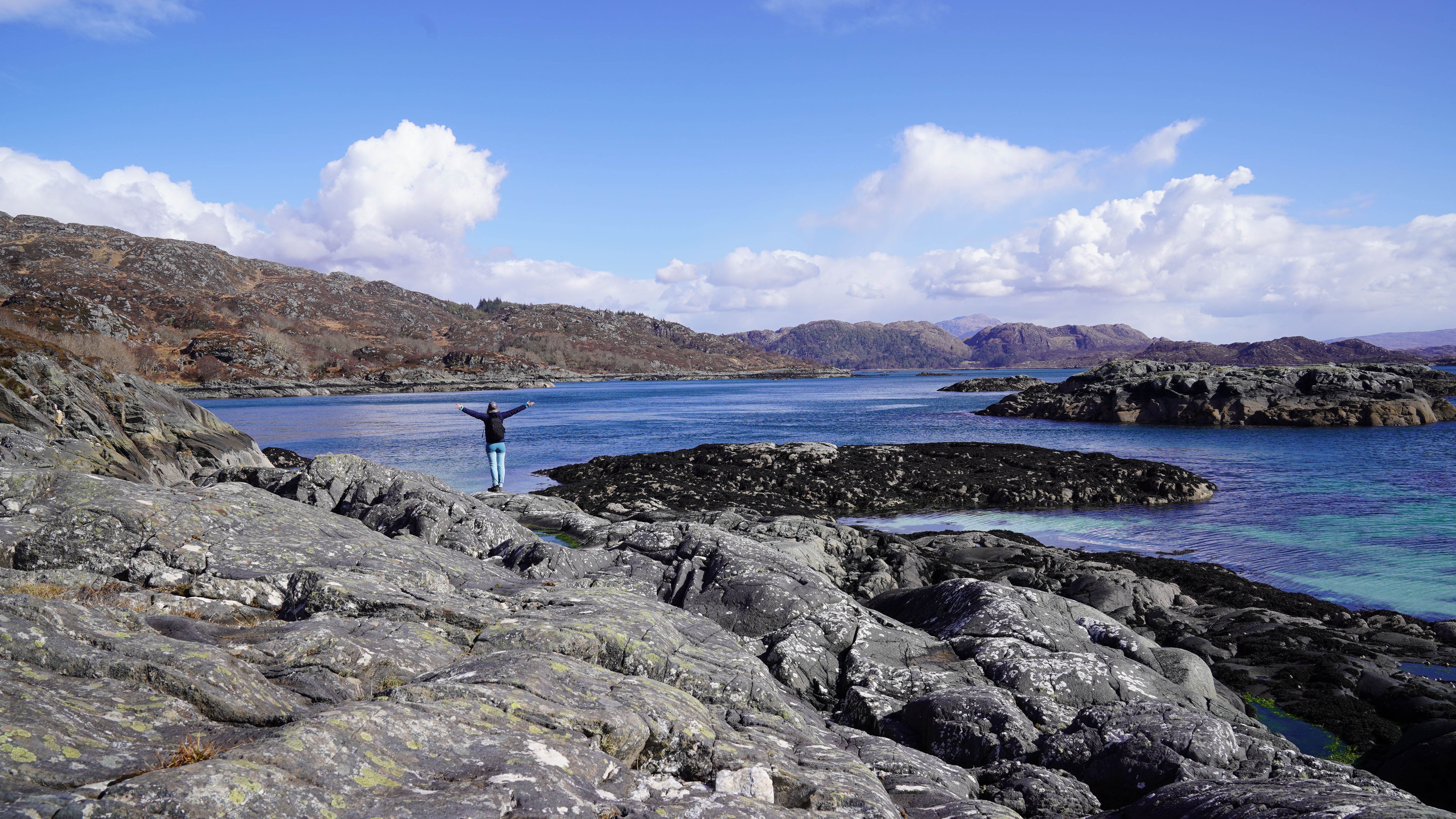 Thankfully the shower was short and the worst of it passed SouthWest of us. The sun re-emerged and the crystal clear blue-green waters were too much for Shona to resist!